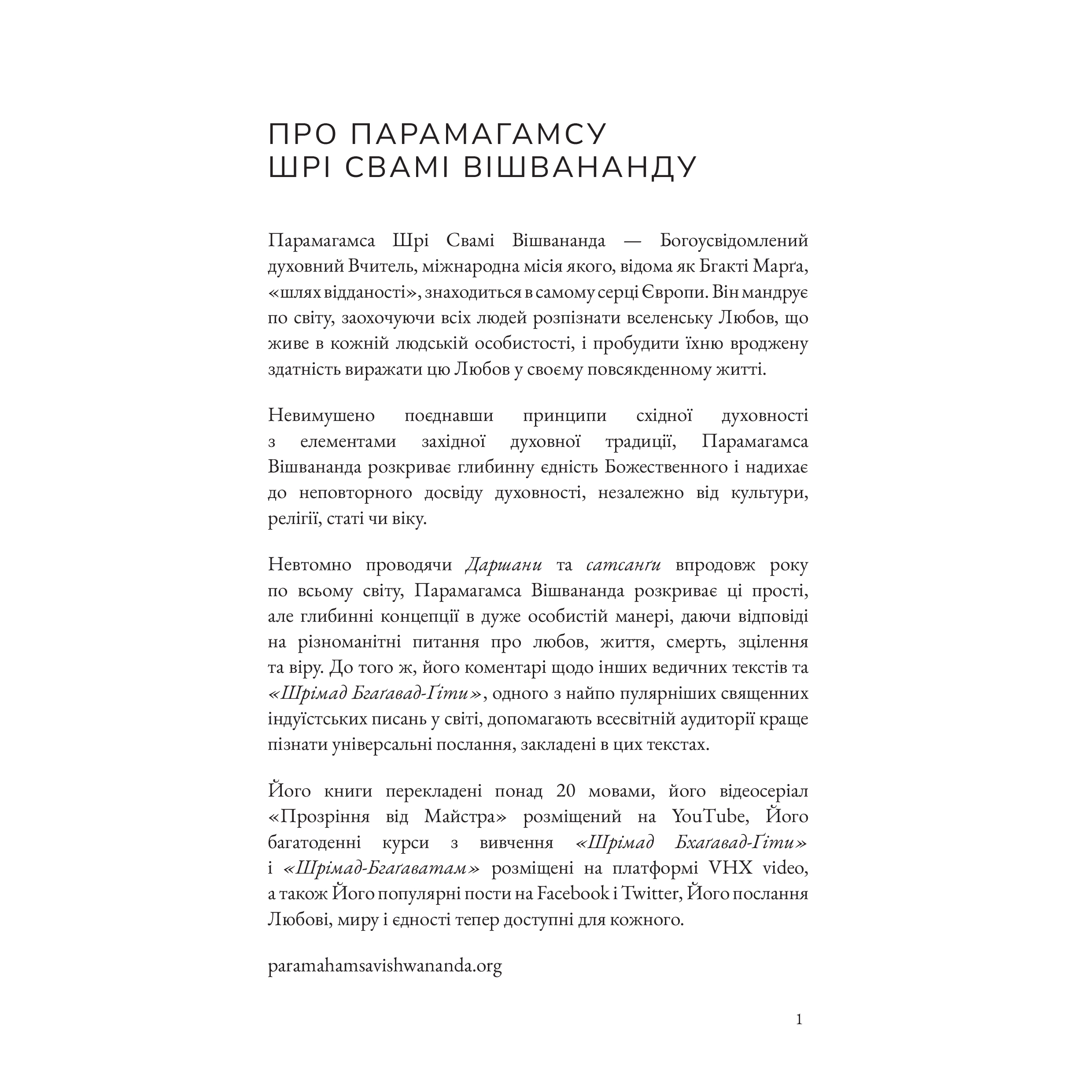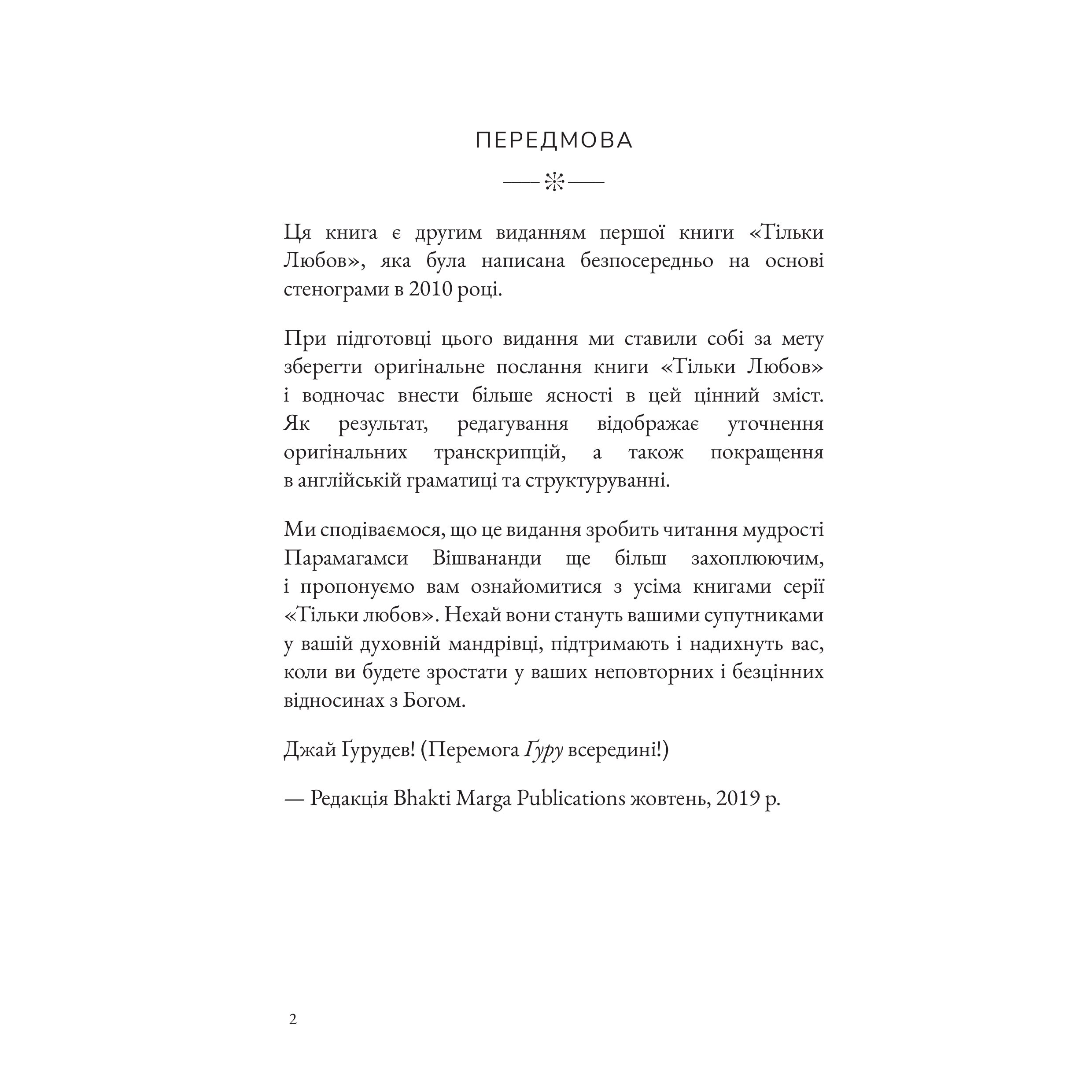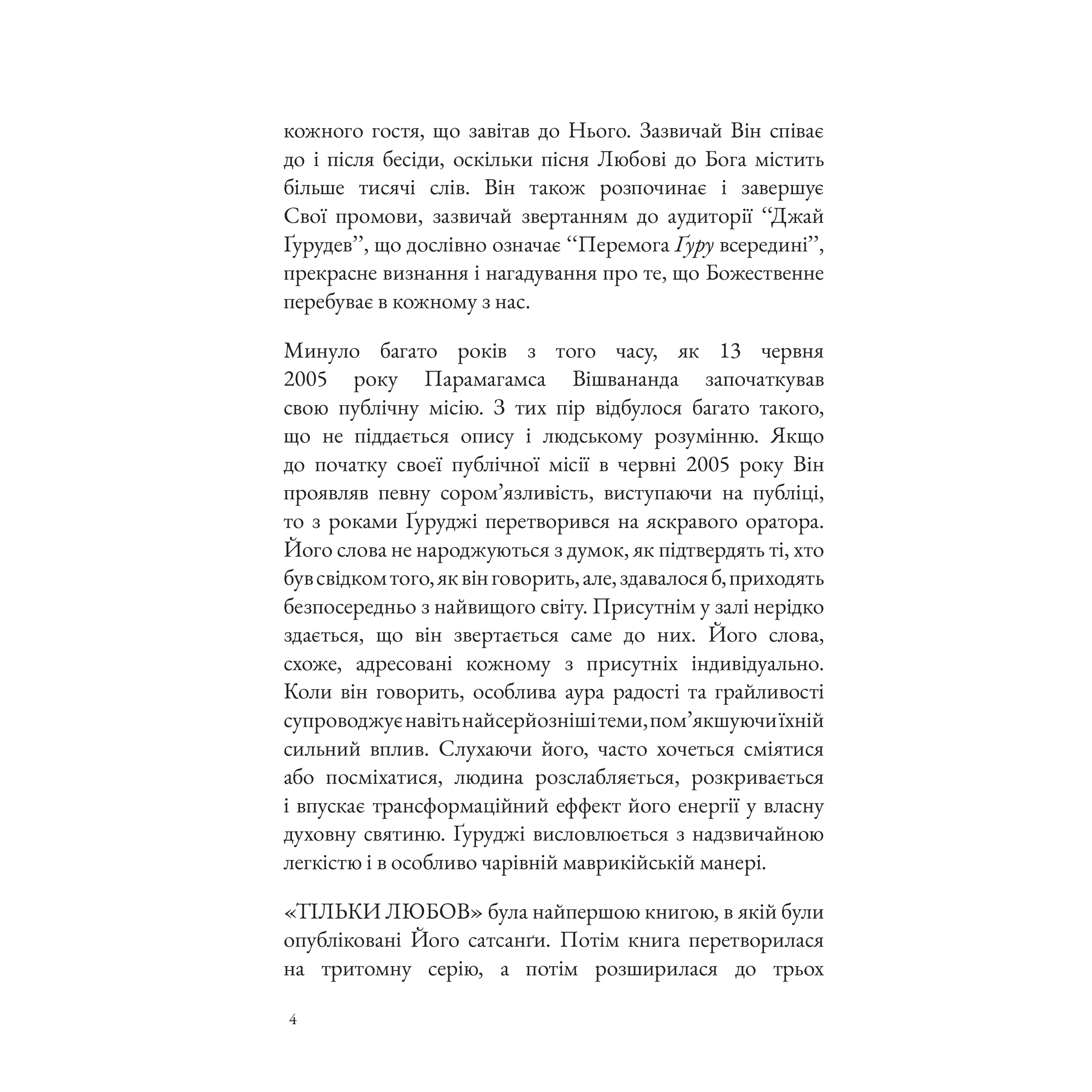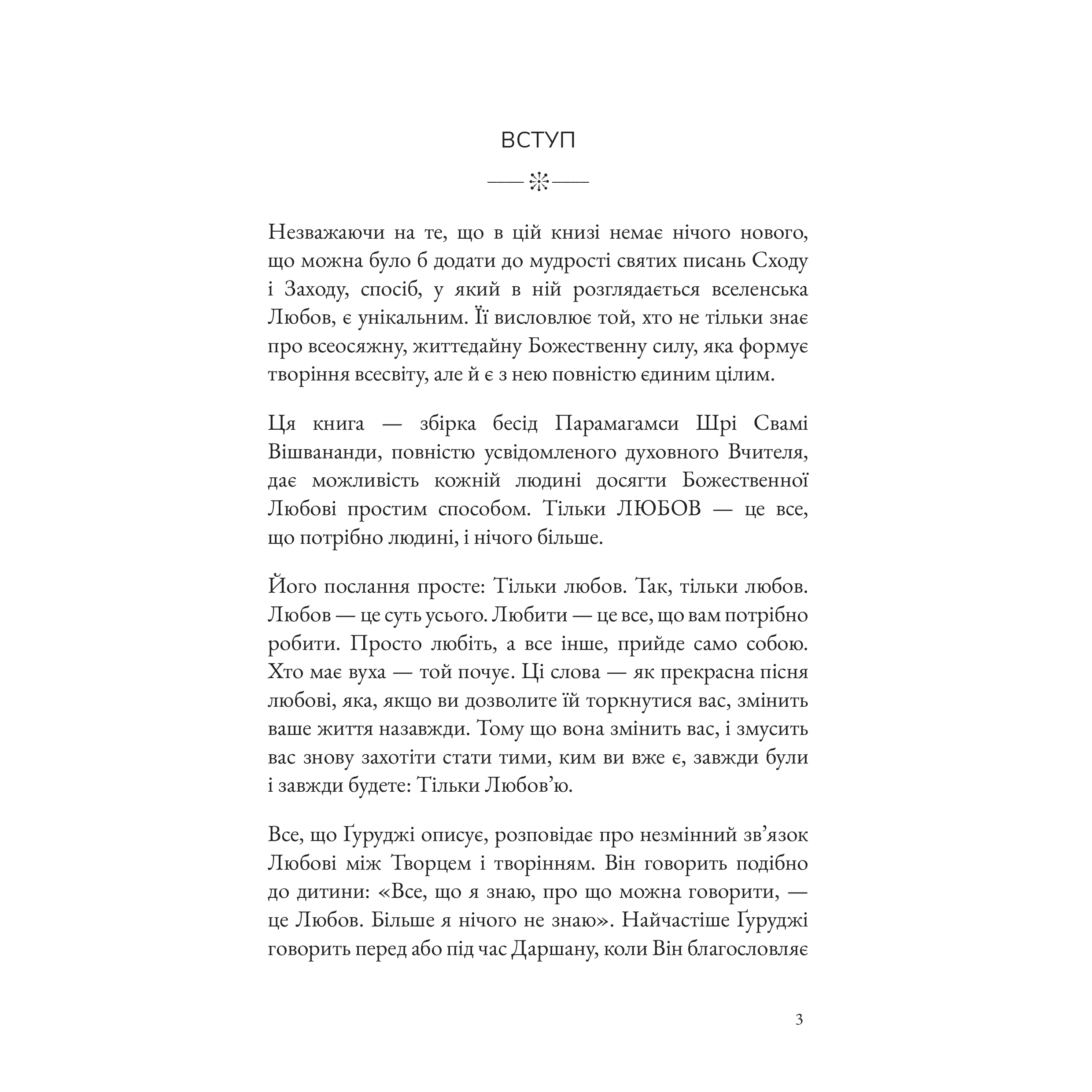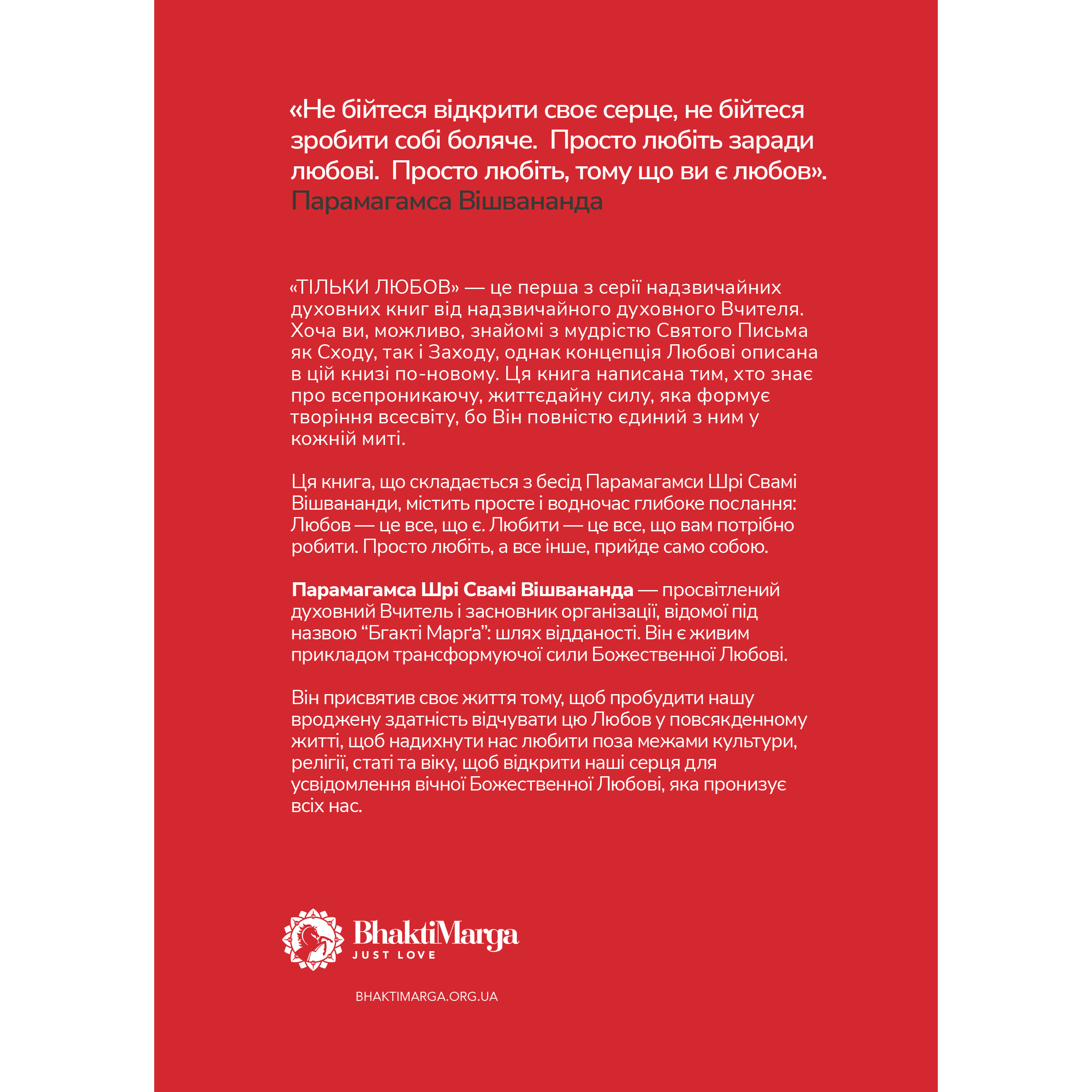 Тільки Любов – це збірка бесід усвідомленого духовного Майстра Парамагамси Вішвананди. Навіть якщо ви знайомі з мудрістю священних писань Сходу та Заходу, у цій книзі ви відкриєте нове для себе, оскільки тут концепція Любові описана інакше. Тільки про Любов розповідає Той, Хто не просто знає про всюдисущу, основну силу, що управляє творенням у всесвіті, але Хто єдиний з Нею в кожний момент часу.